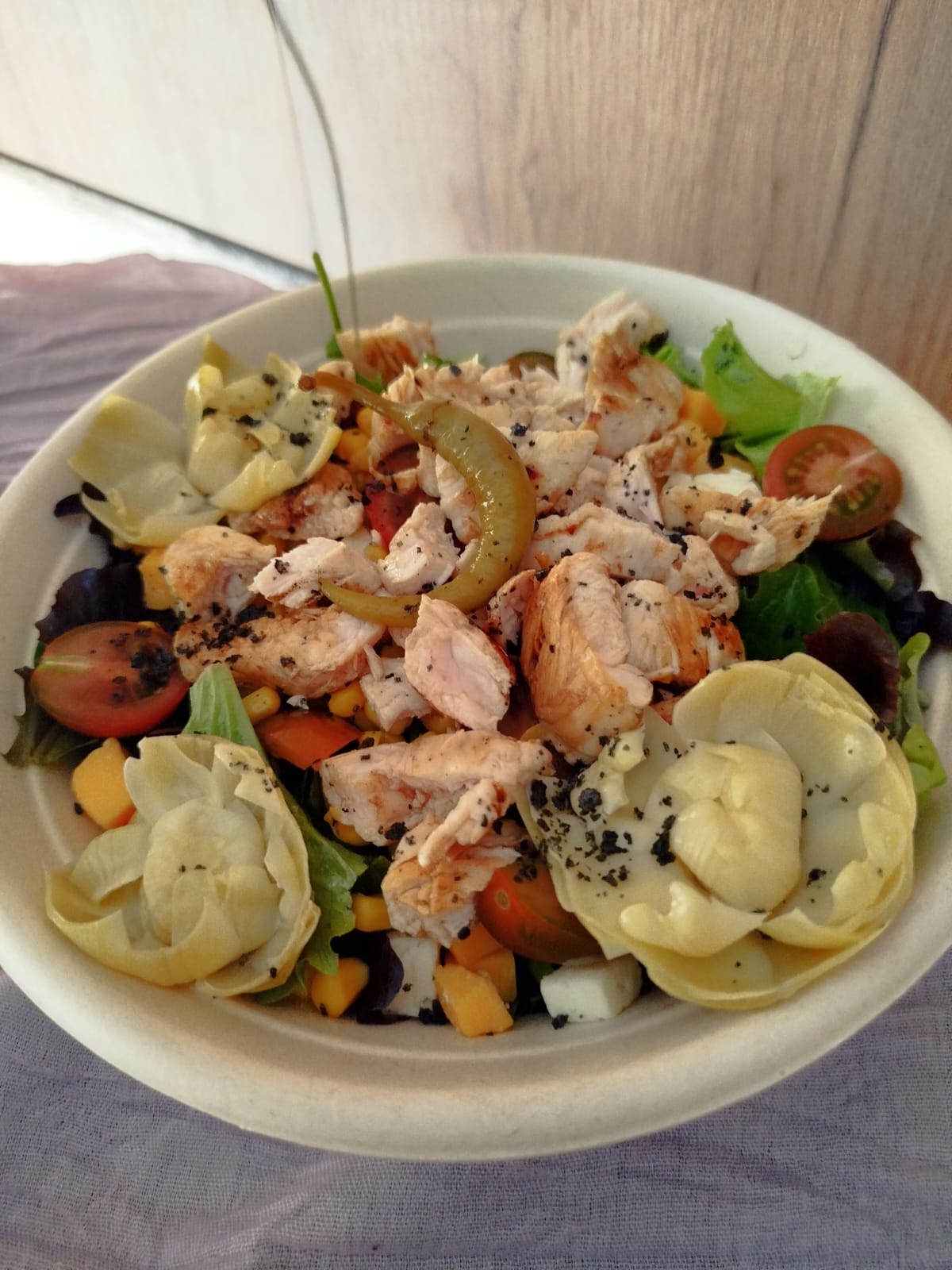 Os ofrecemos una ensalada con brotes tiernos y mezclum, cherrys, queso en dados, maíz dulce, zanahoria rallada, trocitos de pollo marinado con limón.